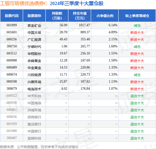 从基金规模来看,工银可转债优选债券C基金2024年三季度公布的基金规模为0.32亿元,较上一期规模3436.86万元变化了-281.14万元,环比变化了-8.18%。该基金最新一期资产配置为:股票占净值比32.33%,债券占净值比87.99%,现金占净值比3.32%。从基金持仓来看,该基金当季前十大股票仓位达22.69%,第一大重仓股为紫金矿业(601899),持仓占比为6.14%。