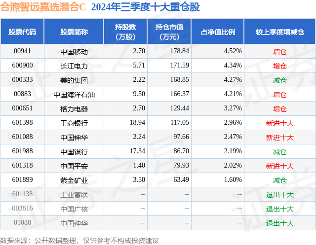 从基金规模来看,合煦智远嘉选混合C基金2024年三季度公布的基金规模为0.24亿元,较上一期规模2.69亿元变化了-2.45亿元,环比变化了-91.18%。该基金最新一期资产配置为:股票占净值比36.04%,债券占净值比0.26%,现金占净值比53.34%。从基金持仓来看,该基金当季前十大股票仓位达31.85%,第一大重仓股为中国移动(00941),持仓占比为4.52%。