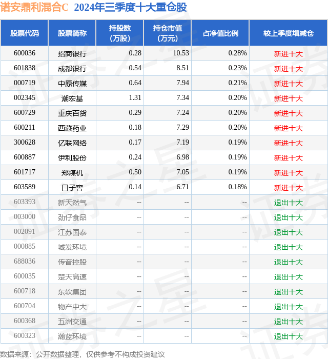 证券之星消息,日前诺安鼎利混合C基金公布三季报,2024年三季度最新规模0.27亿元,季度净值涨幅为3.96%。