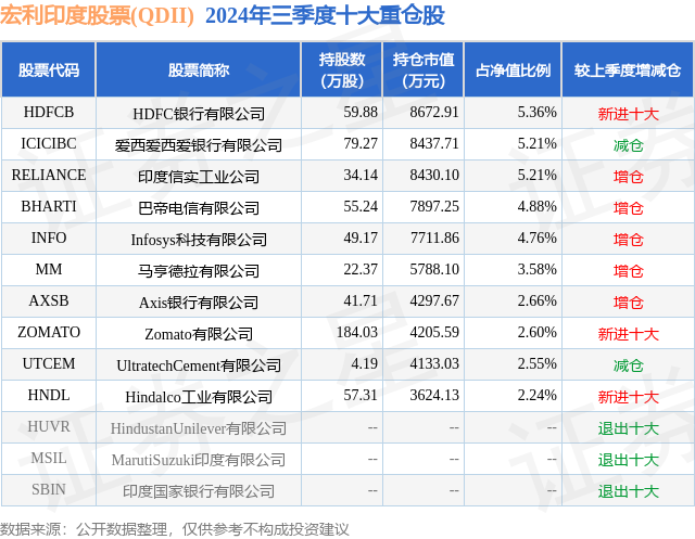 从基金规模来看,宏利印度股票(QDII)基金2024年三季度公布的基金规模为16.19亿元,较上一期规模13.98亿元变化了2.21亿元,环比变化了15.79%。该基金最新一期资产配置为:股票占净值比94.62%,债券占净值比1.49%,现金占净值比8.03%。从基金持仓来看,该基金当季前十大股票仓位达39.05%,第一大重仓股为HDFC银行有限公司(HDFCB),持仓占比为5.36%。