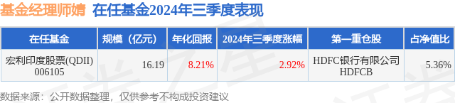 证券之星消息,日前宏利印度股票(QDII)基金公布三季报,2024年三季度最新规模16.19亿元,季度净值涨幅为2.92%。