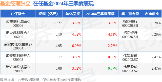 从基金规模来看,诺安鼎利混合A基金2024年三季度公布的基金规模为0.1亿元,较上一期规模1002.51万元变化了16.67万元,环比变化了1.66%。该基金最新一期资产配置为:股票占净值比27.28%,债券占净值比71.92%,现金占净值比0.94%。从基金持仓来看,该基金当季前十大股票仓位达2.07%,第一大重仓股为招商银行(600036),持仓占比为0.28%。