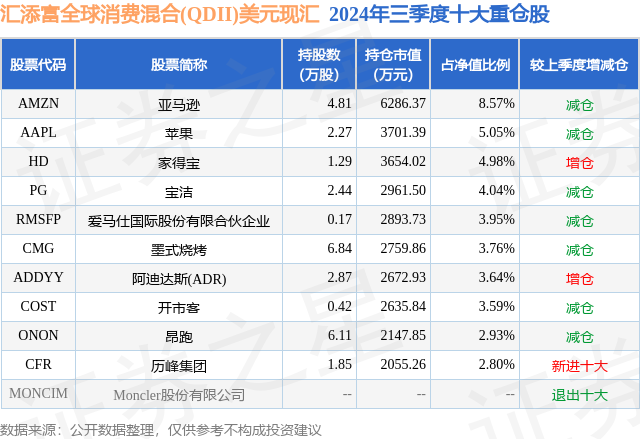 从基金规模来看,汇添富全球消费混合(QDII)美元现汇基金2024年三季度公布的基金规模为1.99亿元,较上一期规模2.08亿元变化了-879.67万元,环比变化了-4.23%。该基金最新一期资产配置为:股票占净值比76.84%,无债券类资产,现金占净值比6.68%。从基金持仓来看,该基金当季前十大股票仓位达43.31%,第一大重仓股为亚马逊(AMZN),持仓占比为8.57%。