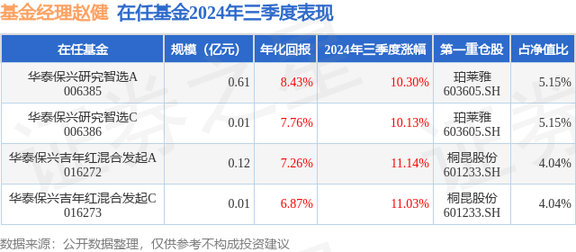华泰保兴研究智选C现任基金经理为赵健。其中在任基金经理赵健已从业6年又139天,2018年11月16日正式接手管理华泰保兴研究智选C,任职期间累计回报为55.91%。目前还管理着4只基金产品(包括A类和C类),其中本季度表现最佳的基金为华泰保兴吉年红混合发起A(016272),季度净值涨幅为11.14%。