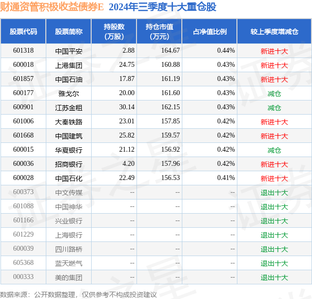 从基金规模来看,财通资管积极收益债券E基金2024年三季度公布的基金规模为1.65亿元,较上一期规模2.04亿元变化了-3919.16万元,环比变化了-19.19%。该基金最新一期资产配置为:股票占净值比12.75%,债券占净值比110.24%,现金占净值比4.54%。从基金持仓来看,该基金当季前十大股票仓位达4.25%,第一大重仓股为中国平安(601318),持仓占比为0.44%。