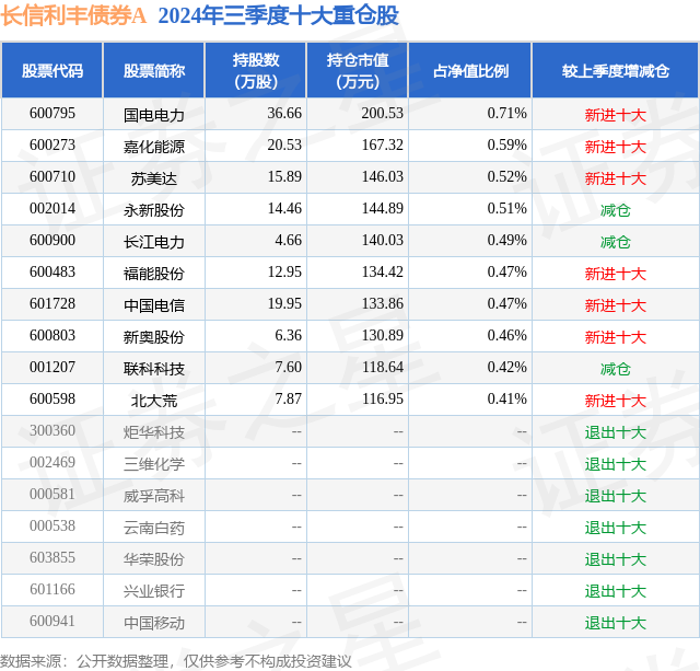 从基金规模来看,长信利丰债券A基金2024年三季度公布的基金规模为0.48亿元,较上一期规模5608.0万元变化了-839.32万元,环比变化了-14.97%。该基金最新一期资产配置为:股票占净值比12.77%,债券占净值比91.94%,现金占净值比2.49%。从基金持仓来看,该基金当季前十大股票仓位达5.05%,第一大重仓股为国电电力(600795),持仓占比为0.71%。