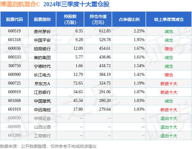 从基金规模来看,博道启航混合C基金2024年三季度公布的基金规模为0.45亿元,较上一期规模4167.77万元变化了312.68万元,环比变化了7.5%。该基金最新一期资产配置为:股票占净值比92.98%,债券占净值比5.05%,现金占净值比2.17%。从基金持仓来看,该基金当季前十大股票仓位达14.75%,第一大重仓股为贵州茅台(600519),持仓占比为2.25%。
