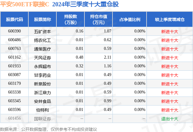 从基金规模来看,平安500ETF联接C基金2024年三季度公布的基金规模为3.46亿元,较上一期规模3.36亿元变化了1003.95万元,环比变化了2.99%。该基金最新一期资产配置为:股票占净值比0.02%,无债券类资产,现金占净值比5.53%。从基金持仓来看,该基金当季前十大股票仓位达0.0%,第一大重仓股为五矿资本(600390),持仓占比为0.0%。