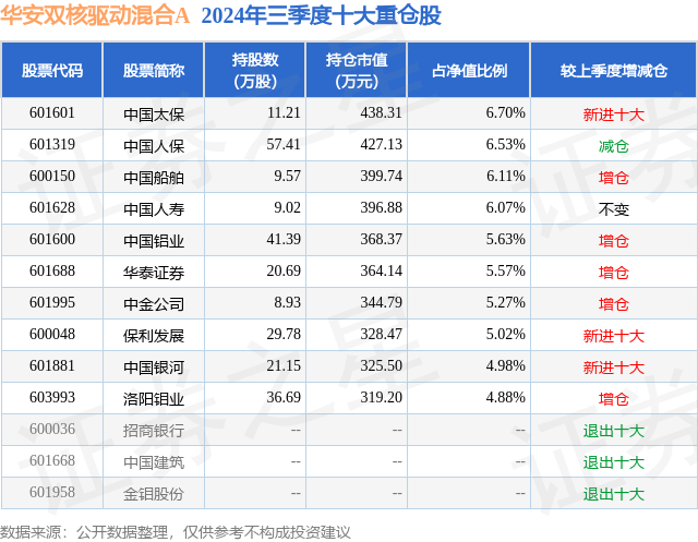 从基金规模来看,华安双核驱动混合A基金2024年三季度公布的基金规模为0.65亿元,较上一期规模5245.78万元变化了1208.92万元,环比变化了23.05%。该基金最新一期资产配置为:股票占净值比92.88%,无债券类资产,现金占净值比5.53%。从基金持仓来看,该基金当季前十大股票仓位达56.76%,第一大重仓股为中国太保(601601),持仓占比为6.7%。