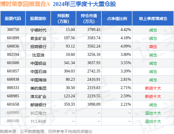 从基金规模来看,博时荣享回报混合A基金2024年三季度公布的基金规模为8.32亿元,较上一期规模11.15亿元变化了-2.82亿元,环比变化了-25.32%。该基金最新一期资产配置为:股票占净值比57.81%,无债券类资产,现金占净值比11.62%。从基金持仓来看,该基金当季前十大股票仓位达33.56%,第一大重仓股为宁德时代(300750),持仓占比为4.42%。