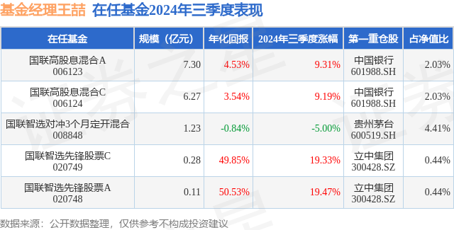 国联高股息混合C现任基金经理为杜超 王喆。其中在任基金经理王喆已从业3年又302天,2024年5月29日正式接手管理国联高股息混合C,任职期间累计回报为3.27%。目前还管理着5只基金产品(包括A类和C类),其中本季度表现最佳的基金为国联智选先锋股票A(020748),季度净值涨幅为19.47%。