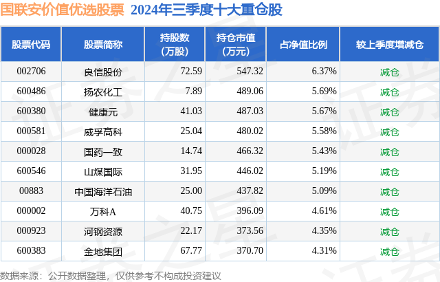 从基金规模来看,国联安价值优选股票基金2024年三季度公布的基金规模为0.86亿元,较上一期规模9979.47万元变化了-1384.5万元,环比变化了-13.87%。该基金最新一期资产配置为:股票占净值比94.55%,债券占净值比2.59%,现金占净值比3.21%。从基金持仓来看,该基金当季前十大股票仓位达52.29%,第一大重仓股为良信股份(002706),持仓占比为6.37%。