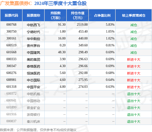 从基金规模来看,广发集嘉债券C基金2024年三季度公布的基金规模为0.67亿元,较上一期规模8834.45万元变化了-2105.2万元,环比变化了-23.83%。该基金最新一期资产配置为:股票占净值比22.94%,债券占净值比79.4%,现金占净值比2.09%。从基金持仓来看,该基金当季前十大股票仓位达12.73%,第一大重仓股为中航西飞(000768),持仓占比为5.83%。