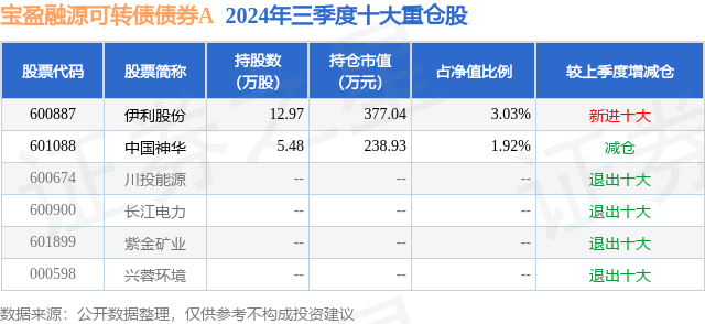 从基金规模来看,宝盈融源可转债债券A基金2024年三季度公布的基金规模为0.67亿元,较上一期规模8038.39万元变化了-1319.2万元,环比变化了-16.41%。该基金最新一期资产配置为:股票占净值比4.96%,债券占净值比105.79%,现金占净值比8.53%。从基金持仓来看,该基金当季前十大股票仓位达4.95%,第一大重仓股为伊利股份(600887),持仓占比为3.03%。