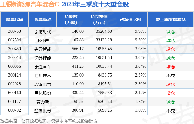 从基金规模来看,工银新能源汽车混合C基金2024年三季度公布的基金规模为16.9亿元,较上一期规模15.7亿元变化了1.19亿元,环比变化了7.58%。该基金最新一期资产配置为:股票占净值比89.26%,无债券类资产,现金占净值比10.33%。从基金持仓来看,该基金当季前十大股票仓位达38.5%,第一大重仓股为宁德时代(300750),持仓占比为9.9%。