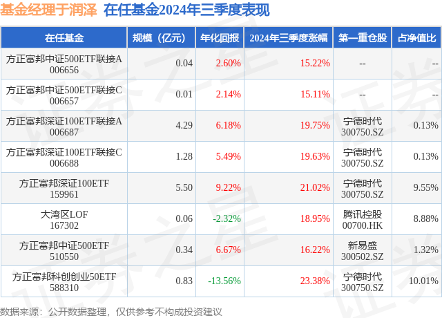 从基金规模来看,方正富邦深证100ETF联接A基金2024年三季度公布的基金规模为4.29亿元,较上一期规模3.99亿元变化了3035.57万元,环比变化了7.61%。该基金最新一期资产配置为:股票占净值比1.36%,债券占净值比0.18%,现金占净值比5.27%。从基金持仓来看,该基金当季前十大股票仓位达0.54%,第一大重仓股为宁德时代(300750),持仓占比为0.13%。