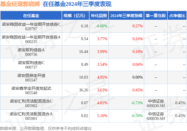 诺安汇利灵活配置混合A现任基金经理为郭晓晖 李晓杰,本季度增聘基金经理郭晓晖、李晓杰,近期离任的基金经理为孔 、王海畅。其中在任基金经理郭晓晖已从业5年又336天,2024年8月26日正式接手管理诺安汇利灵活配置混合A,任职期间累计回报为1.91%。目前还管理着8只基金产品(包括A类和C类),其中本季度表现最佳的基金为诺安鑫享定开债发起式(005548),季度净值涨幅为0.45%。