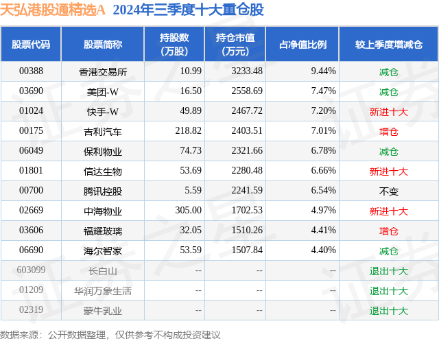 从基金规模来看,天弘港股通精选A基金2024年三季度公布的基金规模为1.55亿元,较上一期规模1.27亿元变化了2774.3万元,环比变化了21.81%。该基金最新一期资产配置为:股票占净值比89.1%,无债券类资产,现金占净值比10.96%。从基金持仓来看,该基金当季前十大股票仓位达64.88%,第一大重仓股为香港交易所(00388),持仓占比为9.44%。