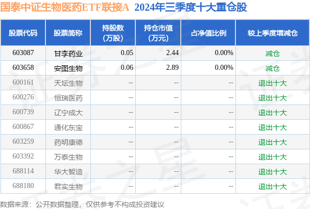从基金规模来看,国泰中证生物医药ETF联接A基金2024年三季度公布的基金规模为2.19亿元,较上一期规模1.88亿元变化了3161.56万元,环比变化了16.84%。该基金最新一期资产配置为:股票占净值比0.01%,债券占净值比1.25%,现金占净值比5.18%。从基金持仓来看,该基金当季前十大股票仓位达0.0%,第一大重仓股为甘李药业(603087),持仓占比为0.0%。