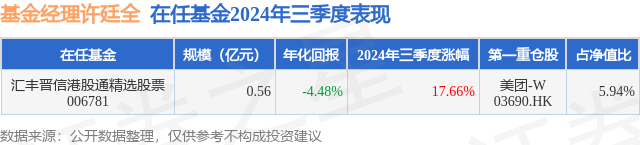 从基金规模来看,汇丰晋信港股通精选股票基金2024年三季度公布的基金规模为0.56亿元,较上一期规模5182.27万元变化了408.37万元,环比变化了7.88%。该基金最新一期资产配置为:股票占净值比92.31%,无债券类资产,现金占净值比8.0%。从基金持仓来看,该基金当季前十大股票仓位达39.71%,第一大重仓股为美团-W(03690),持仓占比为5.94%。