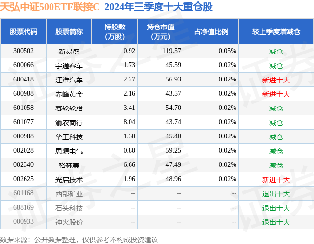 从基金规模来看,天弘中证500ETF联接C基金2024年三季度公布的基金规模为9.26亿元,较上一期规模7.37亿元变化了1.89亿元,环比变化了25.66%。该基金最新一期资产配置为:股票占净值比3.42%,债券占净值比0.15%,现金占净值比4.92%。从基金持仓来看,该基金当季前十大股票仓位达0.23%,第一大重仓股为新易盛(300502),持仓占比为0.05%。