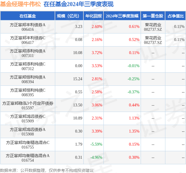 从基金规模来看,方正富邦丰利债券A基金2024年三季度公布的基金规模为3.23亿元,较上一期规模2.73亿元变化了4921.65万元,环比变化了18.0%。该基金最新一期资产配置为:股票占净值比2.71%,债券占净值比129.59%,现金占净值比3.53%。从基金持仓来看,该基金当季前十大股票仓位达0.83%,第一大重仓股为葵花药业(002737),持仓占比为0.11%。