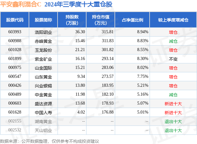 从基金规模来看,平安鑫利混合C基金2024年三季度公布的基金规模为0.35亿元,较上一期规模3412.44万元变化了76.09万元,环比变化了2.23%。该基金最新一期资产配置为:股票占净值比94.02%,债券占净值比4.28%,现金占净值比1.93%。从基金持仓来看,该基金当季前十大股票仓位达70.84%,第一大重仓股为洛阳钼业(603993),持仓占比为8.94%。