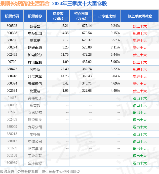 证券之星消息,日前景顺长城智能生活混合基金公布三季报,2024年三季度最新规模0.73亿元,季度净值涨幅为14.63%。