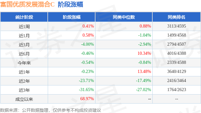 从业绩表现来看,富国优质发展混合C基金过去一年净值涨幅为-3.26%,在同类基金中排名3229/3979,同类基金过去一年净值涨幅中位数为5.4%。而基金过去一年的最大回撤为-19.26%,成立以来的最大回撤为-38.7%。