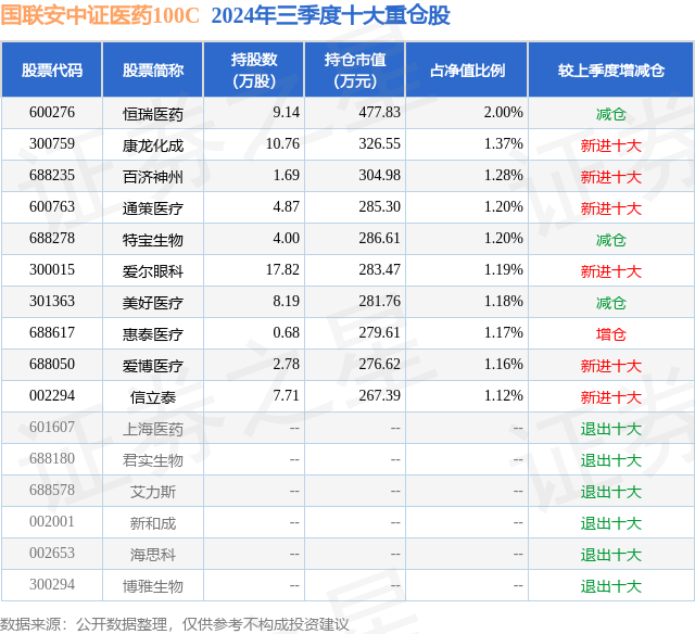 从基金规模来看,国联安中证医药100C基金2024年三季度公布的基金规模为0.57亿元,较上一期规模5986.79万元变化了-306.92万元,环比变化了-5.13%。该基金最新一期资产配置为:股票占净值比94.96%,无债券类资产,现金占净值比6.11%。从基金持仓来看,该基金当季前十大股票仓位达12.87%,第一大重仓股为恒瑞医药(600276),持仓占比为2.0%。