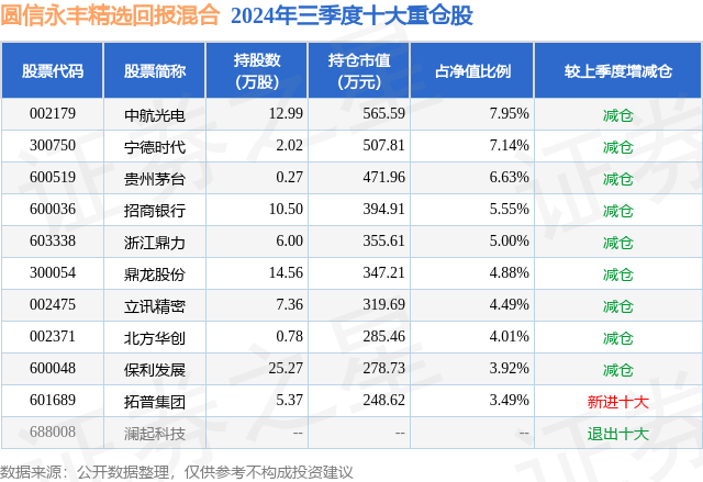 从基金规模来看,圆信永丰精选回报混合基金2024年三季度公布的基金规模为0.71亿元,较上一期规模1.08亿元变化了-3696.08万元,环比变化了-34.19%。该基金最新一期资产配置为:股票占净值比94.74%,债券占净值比5.11%,现金占净值比0.41%。从基金持仓来看,该基金当季前十大股票仓位达53.06%,第一大重仓股为中航光电(002179),持仓占比为7.95%。