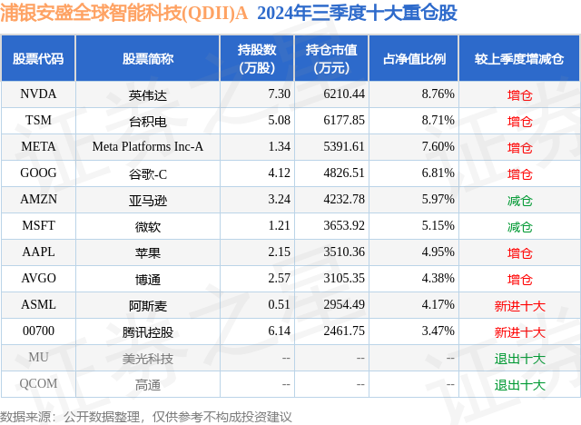 从基金规模来看,浦银安盛全球智能科技(QDII)A基金2024年三季度公布的基金规模为2.42亿元,较上一期规模1.7亿元变化了7191.81万元,环比变化了42.31%。该基金最新一期资产配置为:股票占净值比78.09%,无债券类资产,现金占净值比15.39%。从基金持仓来看,该基金当季前十大股票仓位达59.97%,第一大重仓股为英伟达(NVDA),持仓占比为8.76%。