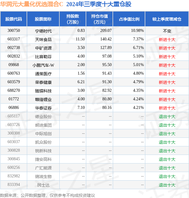 从基金规模来看,华润元大量化优选混合C基金2024年三季度公布的基金规模为0.01亿元,较上一期规模62.87万元变化了9.33万元,环比变化了14.84%。该基金最新一期资产配置为:股票占净值比94.3%,债券占净值比4.8%,现金占净值比1.43%。从基金持仓来看,该基金当季前十大股票仓位达57.56%,第一大重仓股为宁德时代(300750),持仓占比为10.98%。