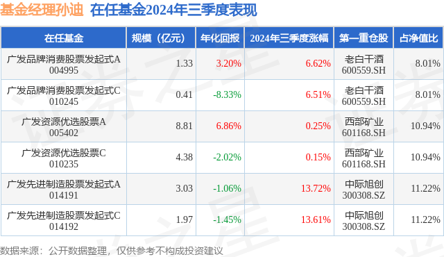 从基金规模来看,广发资源优选股票A基金2024年三季度公布的基金规模为8.81亿元,较上一期规模8.39亿元变化了4247.88万元,环比变化了5.07%。该基金最新一期资产配置为:股票占净值比94.37%,无债券类资产,现金占净值比5.7%。从基金持仓来看,该基金当季前十大股票仓位达79.3%,第一大重仓股为西部矿业(601168),持仓占比为10.94%。