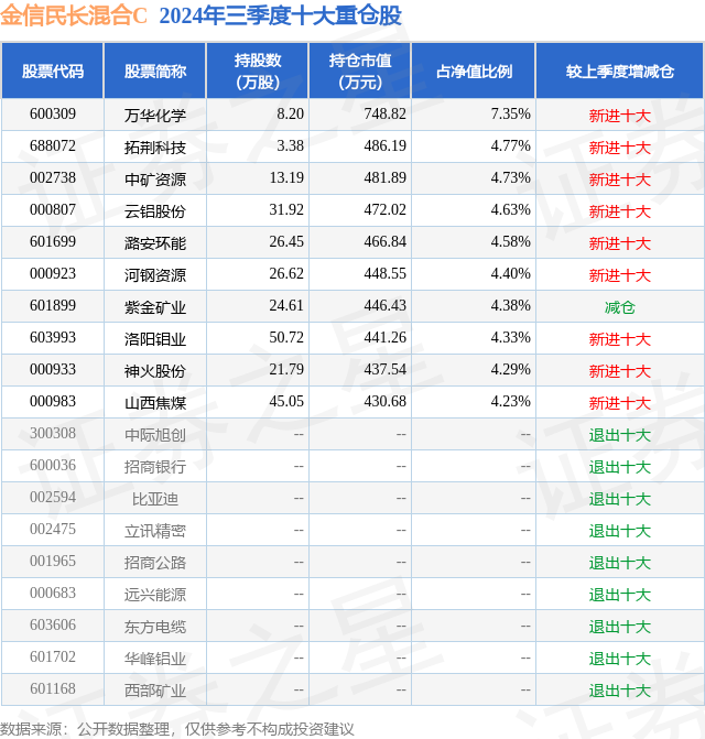 从基金规模来看,金信民长混合C基金2024年三季度公布的基金规模为0.5亿元,较上一期规模6360.7万元变化了-1338.23万元,环比变化了-21.04%。该基金最新一期资产配置为:股票占净值比87.14%,无债券类资产,现金占净值比5.83%。从基金持仓来看,该基金当季前十大股票仓位达47.69%,第一大重仓股为万华化学(600309),持仓占比为7.35%。