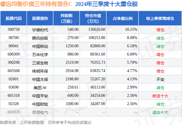 从基金规模来看,睿远均衡价值三年持有混合C基金2024年三季度公布的基金规模为15.16亿元,较上一期规模13.53亿元变化了1.63亿元,环比变化了12.04%。该基金最新一期资产配置为:股票占净值比84.62%,债券占净值比5.21%,现金占净值比1.12%。从基金持仓来看,该基金当季前十大股票仓位达53.12%,第一大重仓股为宁德时代(300750),持仓占比为10.15%。
