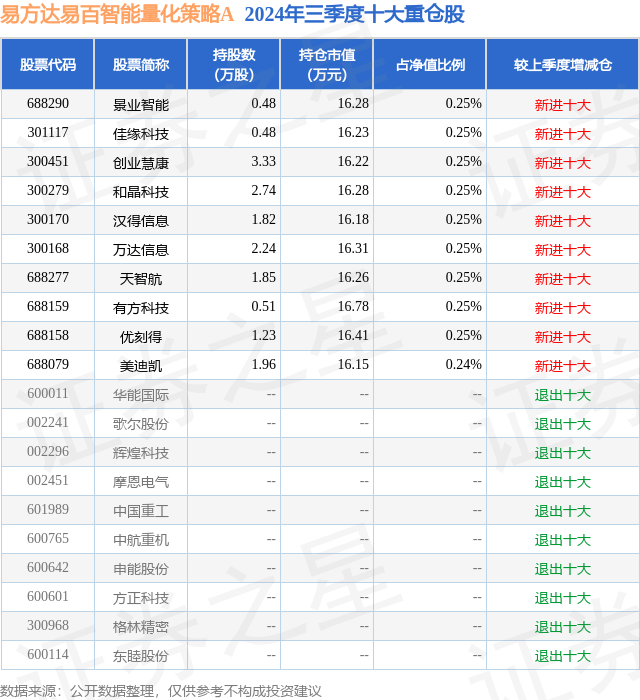 从基金规模来看,易方达易百智能量化策略A基金2024年三季度公布的基金规模为0.55亿元,较上一期规模4632.16万元变化了877.01万元,环比变化了18.93%。该基金最新一期资产配置为:股票占净值比93.7%,无债券类资产,现金占净值比5.73%。从基金持仓来看,该基金当季前十大股票仓位达2.49%,第一大重仓股为景业智能(688290),持仓占比为0.25%。