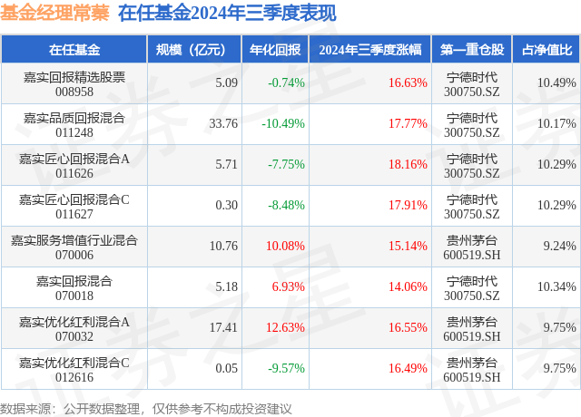 从基金规模来看,嘉实回报精选股票基金2024年三季度公布的基金规模为5.09亿元,较上一期规模4.46亿元变化了6293.85万元,环比变化了14.12%。该基金最新一期资产配置为:股票占净值比86.14%,无债券类资产,现金占净值比13.97%。从基金持仓来看,该基金当季前十大股票仓位达62.16%,第一大重仓股为宁德时代(300750),持仓占比为10.49%。