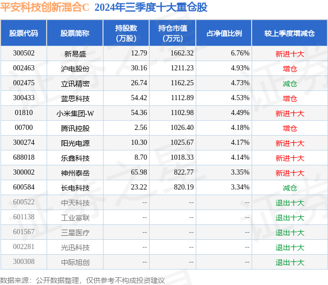 从基金规模来看,平安科技创新混合C基金2024年三季度公布的基金规模为0.78亿元,较上一期规模7520.11万元变化了323.85万元,环比变化了4.31%。该基金最新一期资产配置为:股票占净值比88.11%,无债券类资产,现金占净值比7.11%。从基金持仓来看,该基金当季前十大股票仓位达44.62%,第一大重仓股为新易盛(300502),持仓占比为6.76%。