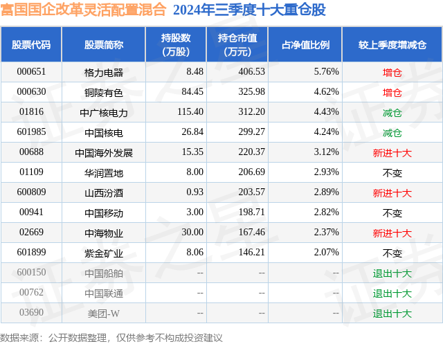 从基金规模来看,富国国企改革灵活配置混合基金2024年三季度公布的基金规模为0.71亿元,较上一期规模6684.21万元变化了367.9万元,环比变化了5.5%。该基金最新一期资产配置为:股票占净值比84.95%,无债券类资产,现金占净值比10.14%。从基金持仓来看,该基金当季前十大股票仓位达35.25%,第一大重仓股为格力电器(000651),持仓占比为5.76%。