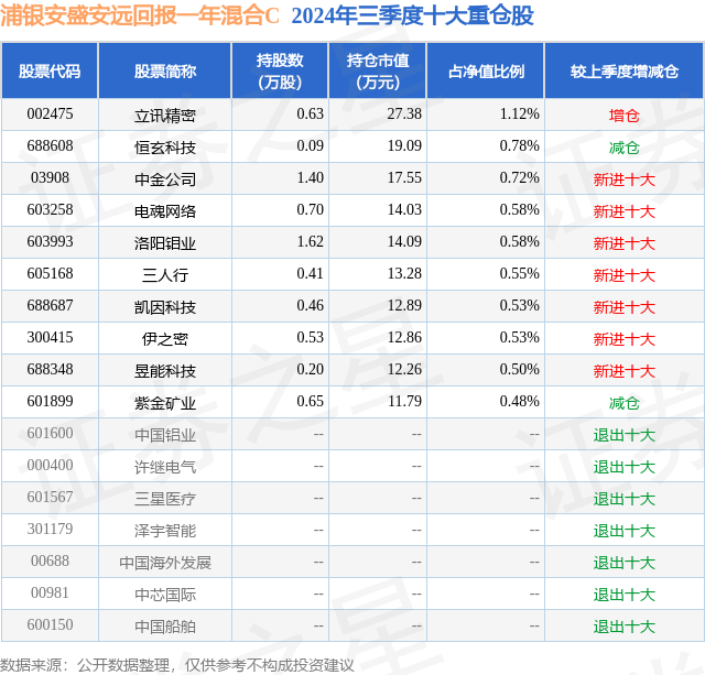 从基金规模来看,浦银安盛安远回报一年混合C基金2024年三季度公布的基金规模为0.02亿元,较上一期规模205.55万元变化了2.86万元,环比变化了1.39%。该基金最新一期资产配置为:股票占净值比16.29%,债券占净值比15.57%,现金占净值比5.09%。从基金持仓来看,该基金当季前十大股票仓位达6.37%,第一大重仓股为立讯精密(002475),持仓占比为1.12%。