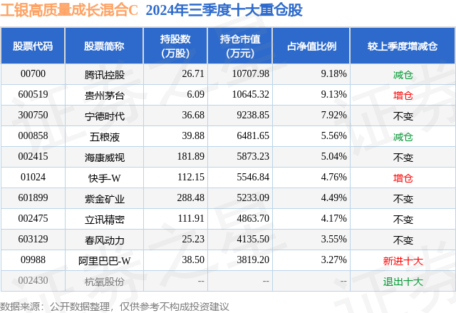 从基金规模来看,工银高质量成长混合C基金2024年三季度公布的基金规模为1.28亿元,较上一期规模1.15亿元变化了1277.25万元,环比变化了11.1%。该基金最新一期资产配置为:股票占净值比87.82%,债券占净值比0.43%,现金占净值比11.84%。从基金持仓来看,该基金当季前十大股票仓位达57.07%,第一大重仓股为腾讯控股(00700),持仓占比为9.18%。