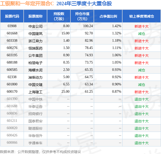 从基金规模来看,工银聚和一年定开混合C基金2024年三季度公布的基金规模为0.03亿元,较上一期规模541.93万元变化了-285.62万元,环比变化了-52.7%。该基金最新一期资产配置为:股票占净值比10.77%,债券占净值比46.12%,现金占净值比16.09%。从基金持仓来看,该基金当季前十大股票仓位达10.76%,第一大重仓股为中金公司(03908),持仓占比为1.42%。