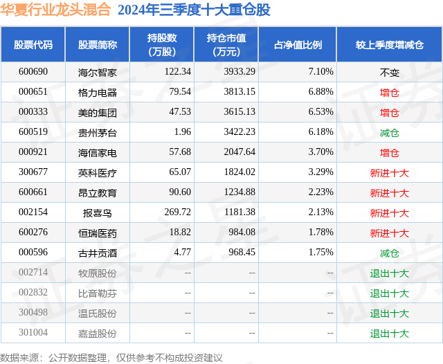 从基金规模来看,华夏行业龙头混合基金2024年三季度公布的基金规模为5.54亿元,较上一期规模5.13亿元变化了4141.89万元,环比变化了8.08%。该基金最新一期资产配置为:股票占净值比90.52%,债券占净值比3.61%,现金占净值比10.41%。从基金持仓来看,该基金当季前十大股票仓位达41.57%,第一大重仓股为海尔智家(600690),持仓占比为7.1%。