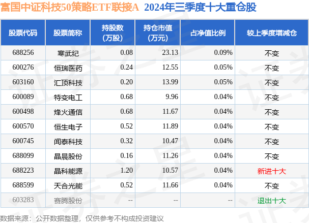 从基金规模来看,富国中证科技50策略ETF联接A基金2024年三季度公布的基金规模为1.74亿元,较上一期规模1.49亿元变化了2503.88万元,环比变化了16.78%。该基金最新一期资产配置为:股票占净值比0.85%,债券占净值比4.53%,现金占净值比0.77%。从基金持仓来看,该基金当季前十大股票仓位达0.47%,第一大重仓股为寒武纪(688256),持仓占比为0.09%。