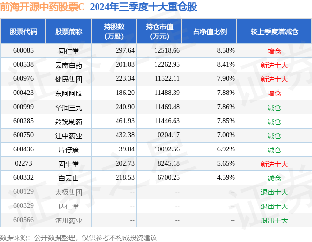 从基金规模来看,前海开源中药股票C基金2024年三季度公布的基金规模为7.33亿元,较上一期规模6.47亿元变化了8602.51万元,环比变化了13.3%。该基金最新一期资产配置为:股票占净值比91.6%,无债券类资产,现金占净值比9.45%。从基金持仓来看,该基金当季前十大股票仓位达72.64%,第一大重仓股为同仁堂(600085),持仓占比为8.58%。