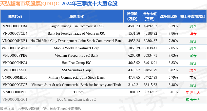 从基金规模来看,天弘越南市场股票(QDII)C基金2024年三季度公布的基金规模为22.98亿元,较上一期规模27.29亿元变化了-4.31亿元,环比变化了-15.79%。该基金最新一期资产配置为:股票占净值比93.83%,债券占净值比0.78%,现金占净值比6.94%。从基金持仓来看,该基金当季前十大股票仓位达71.06%,第一大重仓股为Saigon Thuong T in Commercial J SB(VN000000STB4),持仓占比为8.39%。