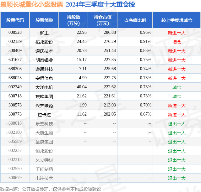 从基金规模来看,景顺长城量化小盘股票基金2024年三季度公布的基金规模为3.03亿元,较上一期规模3.11亿元变化了-774.05万元,环比变化了-2.49%。该基金最新一期资产配置为:股票占净值比94.42%,债券占净值比0.02%,现金占净值比5.42%。从基金持仓来看,该基金当季前十大股票仓位达7.74%,第一大重仓股为柳工(000528),持仓占比为0.95%。