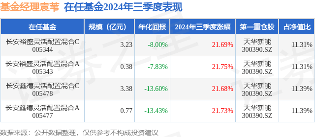 证券之星消息,日前长安鑫禧灵活配置混合A基金公布三季报,2024年三季度最新规模0.77亿元,季度净值涨幅为21.73%。