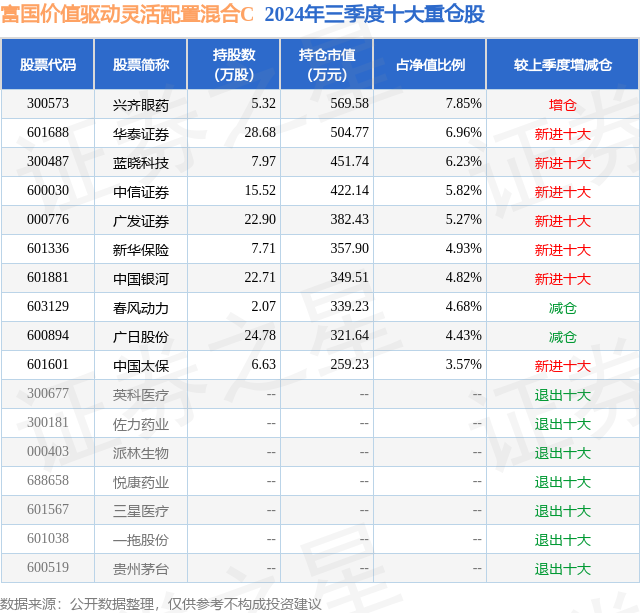 从基金规模来看,富国价值驱动灵活配置混合C基金2024年三季度公布的基金规模为0.11亿元,较上一期规模1241.93万元变化了-147.65万元,环比变化了-11.89%。该基金最新一期资产配置为:股票占净值比83.71%,无债券类资产,现金占净值比31.7%。从基金持仓来看,该基金当季前十大股票仓位达54.56%,第一大重仓股为兴齐眼药(300573),持仓占比为7.85%。